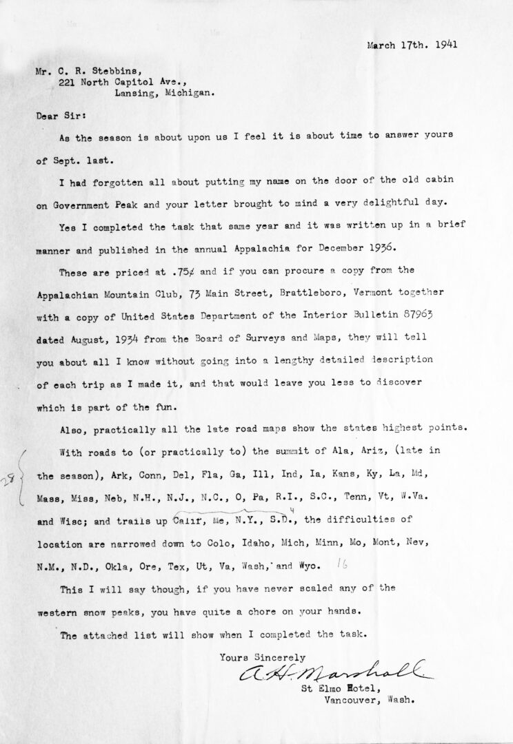 Marshall wrote C.R. Stebbins in 1941 giving him the list. Marshall subsequently gave Stebbins his journals for the climbs (and the rest of his life) with the direction that it be given to the Mazamas Club. The manuscript was presented in June 2012 and can be read here.