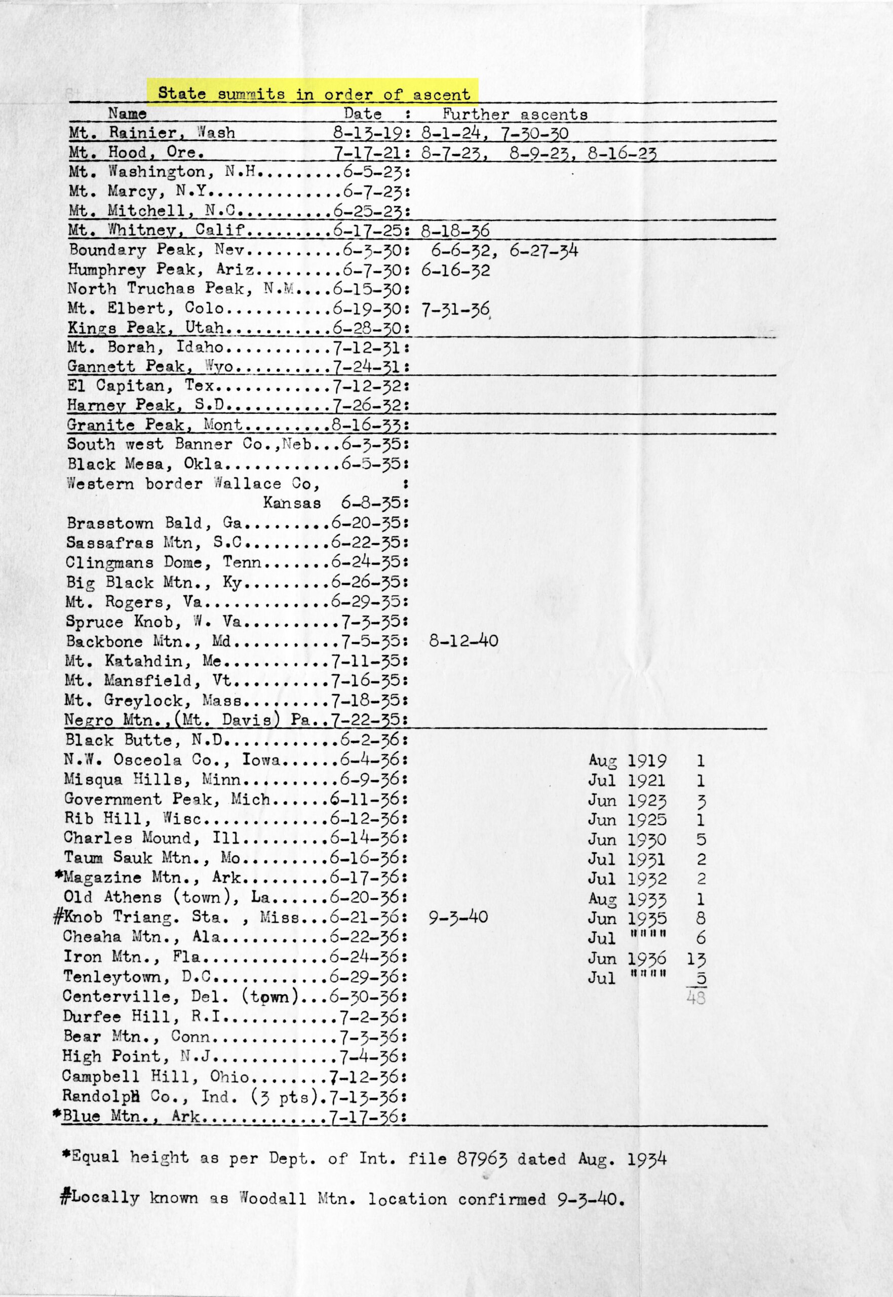 Marshall wrote C.R. Stebbins in 1941 giving him the list. Marshall subsequently gave Stebbins his journals for the climbs (and the rest of his life) with the direction that it be given to the Mazamas Club. The manuscript was presented in June 2012 and can be read here.