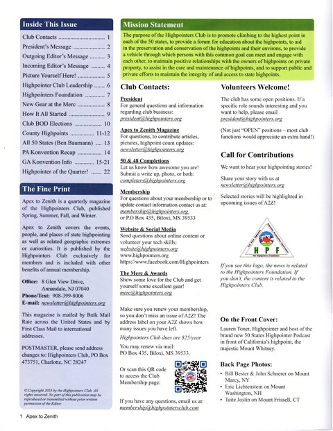 Apex to Zenith first quarter (winter) 2023 Mar 24, 2023 By Highpointers Club Posted in Newsletter Note: Second, Third, and Fourth Quarters of 2022 not published.