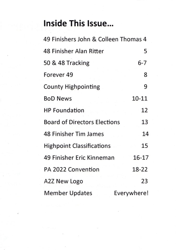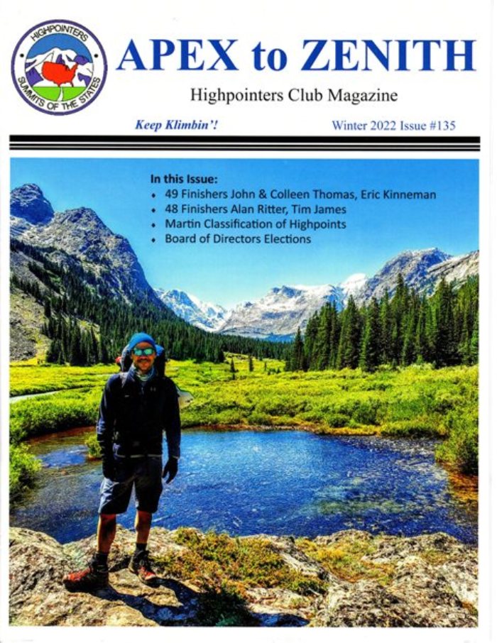 Apex to Zenith first quarter (winter) 2022 Oct 16, 2022 By Highpointers Club Posted in Newsletter Note: Fourth Quarter 2021 not published. Note: First Quarter is now the “Winter” issue. Issue 135 published in June 2022.