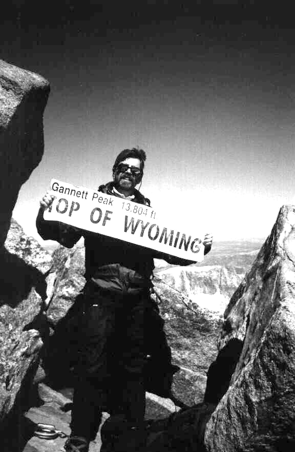 I guess you do what you have to do. As I hurried and guzzled my coffee it was 3:45am by the time we left camp. With our head lamps on we scrambled over streams, and up and down rocks. It was a new moon which made it difficult to negotiate our way. Route finding was very difficult and the only light was about five feet in front of us from our headlamps. I knew we were in for a real sufferfest for the day, especially starting off feeling sick. As we spent several hours sensing our way through the rubble we were about a third of the way up the pass when I had to stop to take care of business. After about fifteen minutes of doing the dirty deed, we were on our way when I discovered I left my glacier glasses in the tent. Wow, what a rookie mistake. Climbing all day on glaciers would surely blind a person without protection. John was the man, he gave me his glasses to use while he wore his contact lenses that had UV inhibitors built in. As we climbed 2000 feet to Dinwoody Pass we watched the sun rise and shine on Gannett Peak. What a majestic summit in all of its glory! Looking over the Wind River Range at sunrise above the Dinwoody and Gooseneck glaciers was a sight I will never forget. As we started our descent down the Dinwoody Glacier tied together, with our ice axes in hand and our crampons biting into the ice, I knew at that point we were going to reach the summit. The conditions were very poor. The glaciers were very melted out for this time of year. We were stepping across and jumping many crevasses. John was leading and doing a very fine job at route finding. At this point the ominous clouds above us were very dark and it was snowing. We caught up to a NOLS guided group and passed them before the slopes of the summit steepened dramatically. Skirting around the bergshrund (big open crevasse) we climbed above it to a steep 50 degree ice face that was very hard consolidated snow. John took off leading and I had him on a hip belay. As the rope became tight I fol-lowed. Both of us climbing together on the same rope, was to say the least, concerning. We were, as some refer to it, “solo climbing.” If either one of us fell, that would be pretty much it, no summit, no fun, lights out! That didn’t happen. With the karma with us we continued our quest climbing over several rock ribs, more snow, and up to the summit ridge. It was there, five minutes from the summit, I told John, “this is my 50th hi-point”. I was trying to keep it a secret till the summit but I couldn’t. It was hard enough keeping it a secret for the last year. We arrived at the summit at 10:30am July 20, 2001. For me 15 years of traveling the country in the hope of summiting the highest point of all 50 states has come down to being here and now on top of Gannett Peak in the Wind River Range in Wyoming. We both had to keep the mojo working cause we were only half way and needed to get back to camp.