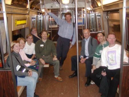 100 Below the Highpoint on the “A” Train — From Left Laura Potapoff, Jenni Blumenthal, Dawn Howard, Unknown Mystery Rider, John Mitchler, Sjakk van Schie, Ralph Blumenthal, Lanny Wexler, David KocianFrom here they descended 100 feet (“12 stories” according to the elevator operator) to the “A” Train to return.