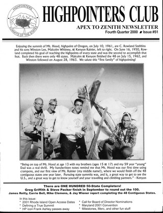 | Highpoint Updates • Alaska – Denali • Arizona – Humphyreys Peak • Hawaii – Mauna Kea • Maryland – Backbone Mountain • Michigan – Mt Arvon • Minnesota – Eagle Mountain • Mississippi – Woodall Mountain • New Hampshire – Mt Washington • New Mexico – Wheeler Peak • New York – Mt Marcy • Ohio – Campbell Hill • Pennsylvania – Mt Davis • Rhode Island – Jerimonth Hill • South Dakota – Harney Peak • Washington – Mt Rainier • West Virginia – Spruce Knob |