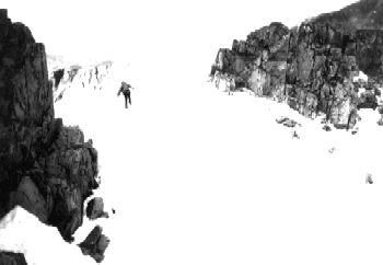 And then the weather joined the party. It just rolled in, right into us as wehe first of the three chimneys. Visibility was 20 feet. Rain changing to sleet. Snow pellets changing to rain. Wet moss and lichen staying slippery when wet. All of us route finding at one time or another as we clawed and grabbed at that mountain til our fingers bled. It suddenly dawned on me where I had seen this before. Gregory Peck and The Guns of Navarone. That was us.