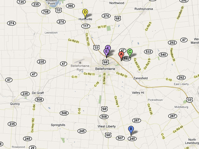 5:00 PM – 6:30 PM Kocktails / Hors D’oeuvres at Huntsville Event Center, 6886 Wishart Street, Huntsville, OH (Yellow D on map north of Bellefontaine)